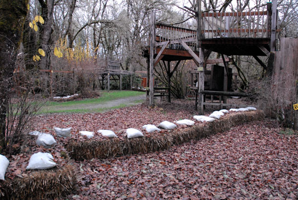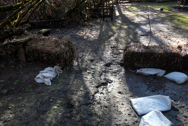 Straw bale dams, weighed down with sand bags, help slow floodwaters on the paths.