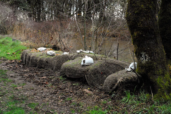 Bale dam levees, held together with biodegradable fabric, are being tested for their effectiveness in reducing scouring erosion.