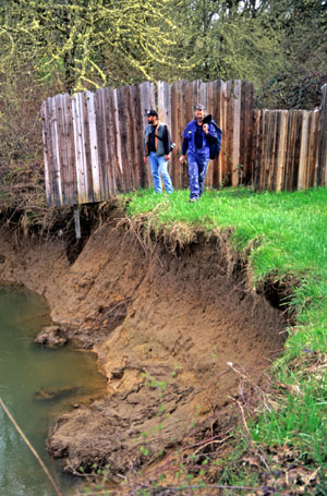 Steve and Bob examine the cut bank at Chela Mela Meadow. The channel is typically ten to twelve feet deep. The soil is young and unconsolidated, offering little resistance to erosion. Sustained efforts to plant vegetation that would control erosion have come to naught because the river concentrates its erosive force on the vertical wall of the cut bank, where no vegetation will grow. Plantings at the toe of the bank do nothing to slow erosion.
