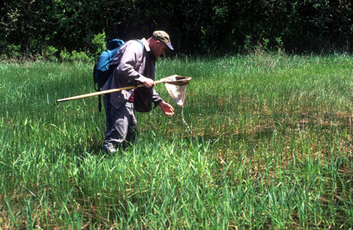 Chris, a Federal wildlife biologist, surveys aquatic life in Miss Piggy's parking lot, which stays flooded through most winters and provides a nursery for a host of creatures..
