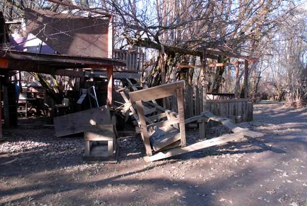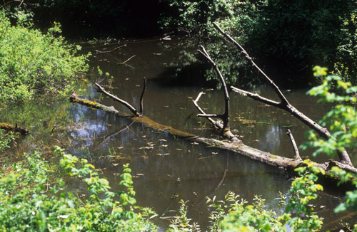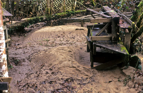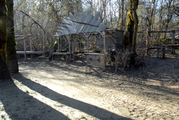 The Long Tom River is a low-gradient, meandering waterway that moves actively across its floodplain at the Oregon Country Fair. In some areas, the river bank has moved as much as 100 feet in the four decades that OCF has been on its banks. Other reaches have been remarkably stable. For example, a road crossed the site 150 years ago. The banks where the pioneers forded the river have not moved and the logs laid in the river bed as a corduroy road remain in place.