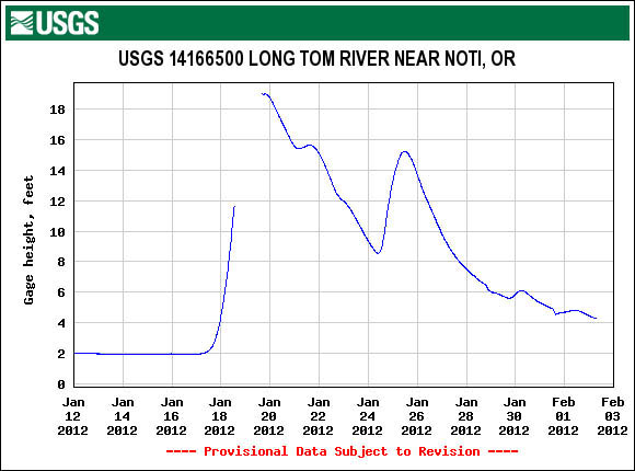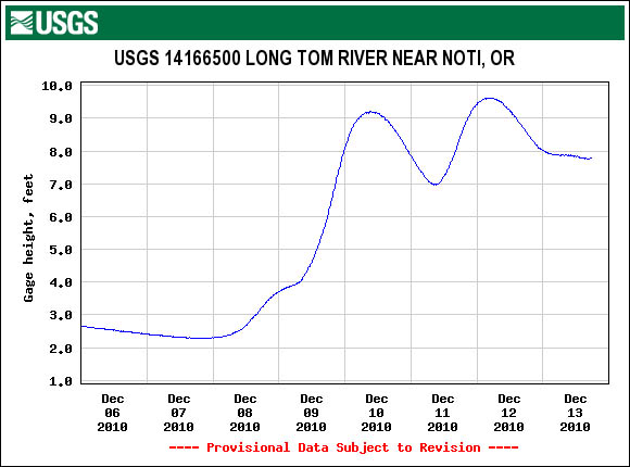 The USGS Long Tom River gage at Noti measures the river's flow. As a general guide, river heights over 10 feet indicate flooding on the site.