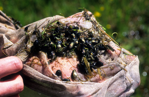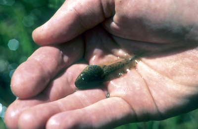 A net full of tree frog tadpoles found in Miss Piggy's. Juvenile fish, water fowl, amphibians, reptiles, and insect larvae also thrive in the flooded parking lots.