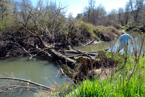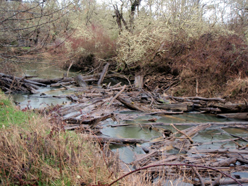 The log jam along Strawberry Lane accumulates material from upstream. The log jam provides habitat and refuge for many creatures.