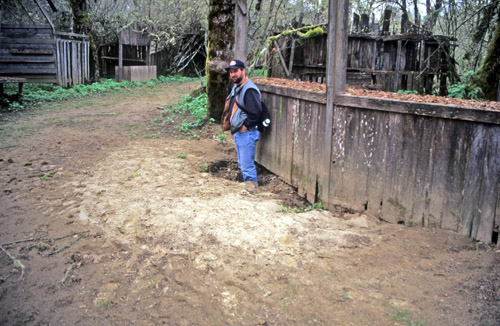 Steve stands in a scour hole that flood currents dug under a booth front. Booth construction guidelines now require removable front panels and fence panels in flood-prone areas.