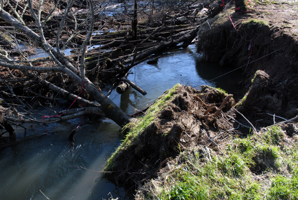 Every flood rearranges the log jam. Bank slumps occur frequently at certain hot spots (see aerial photo). On the right in this March 2010 Strawberry Lane photo is a maple tree planted some 30 feet away from the river bank in the early 1990s. It began its fall into the river in December, 2011.