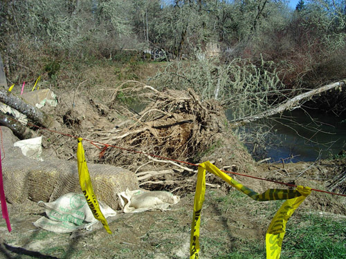 This Strawberry Lane maple, one of the few left of many planted in the early 1990s, was undercut in December 2011 floods. The January 2012 floods toppled it into the river. Riparian trees do not stop erosion; instead, they may worsen its effects by taking great wads of soil with them as they fall. (Feb. 2, 2012)