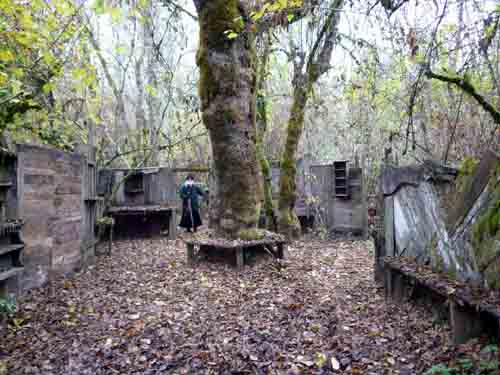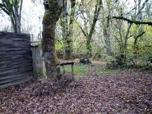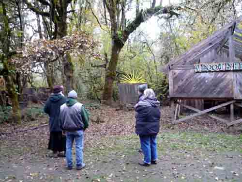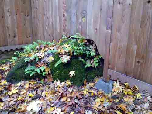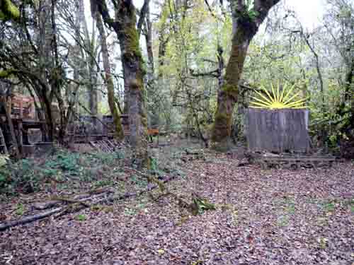Photos 0, 1: Between Dana’s Cheesecake and Blue Moon Stage sound booth is a tucked away eating area that could be enhanced & opened up by trimming back the Ninebark. Behind this spot is a backstage area called the “Green Room” which is used by performers. A pipe that drains a toilet hand washing station into Colleen’s camp was noted.